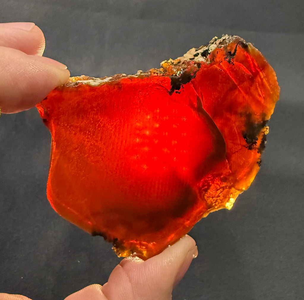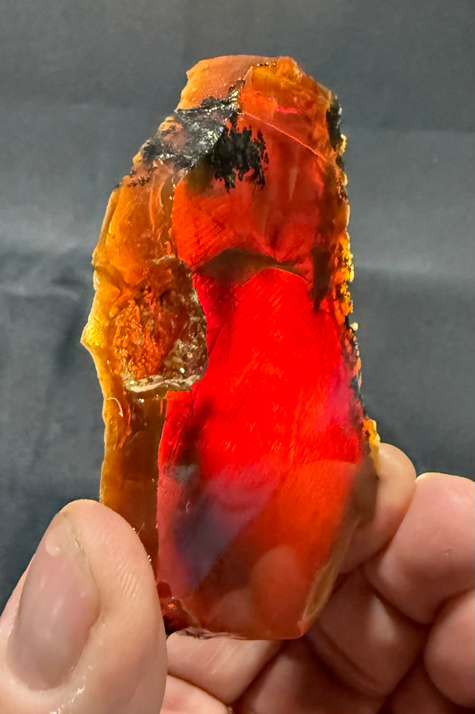 75 gram Oregon chocolate fire opal slab mined by Outlaw Rocks at our Opal Queen Mine. Measures approximately 3. Inches by 2 inches and is 1/4 inch thick. Photos are backlit.